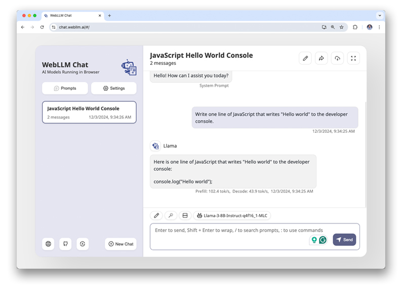 WebLLM هو منصّة تشغيل مستندة إلى الويب للنماذج اللغوية الكبيرة (LLM) تقدّمها ميزة "تجميع تعلُّم الآلة". يمكنك تجربة WebLLM كتطبيق مستقل. استُوحي التطبيق من تطبيقات المحادثة المستندة إلى السحابة الإلكترونية، مثل Gemini، ولكن يتم تنفيذ الاستنتاج باستخدام نموذج اللغة الكبيرة على جهازك بدلاً من السحابة الإلكترونية. لا تغادر طلباتك وبياناتك جهازك أبدًا، ويمكنك التأكّد من أنّه لا يتم استخدامها لتدريب النماذج.