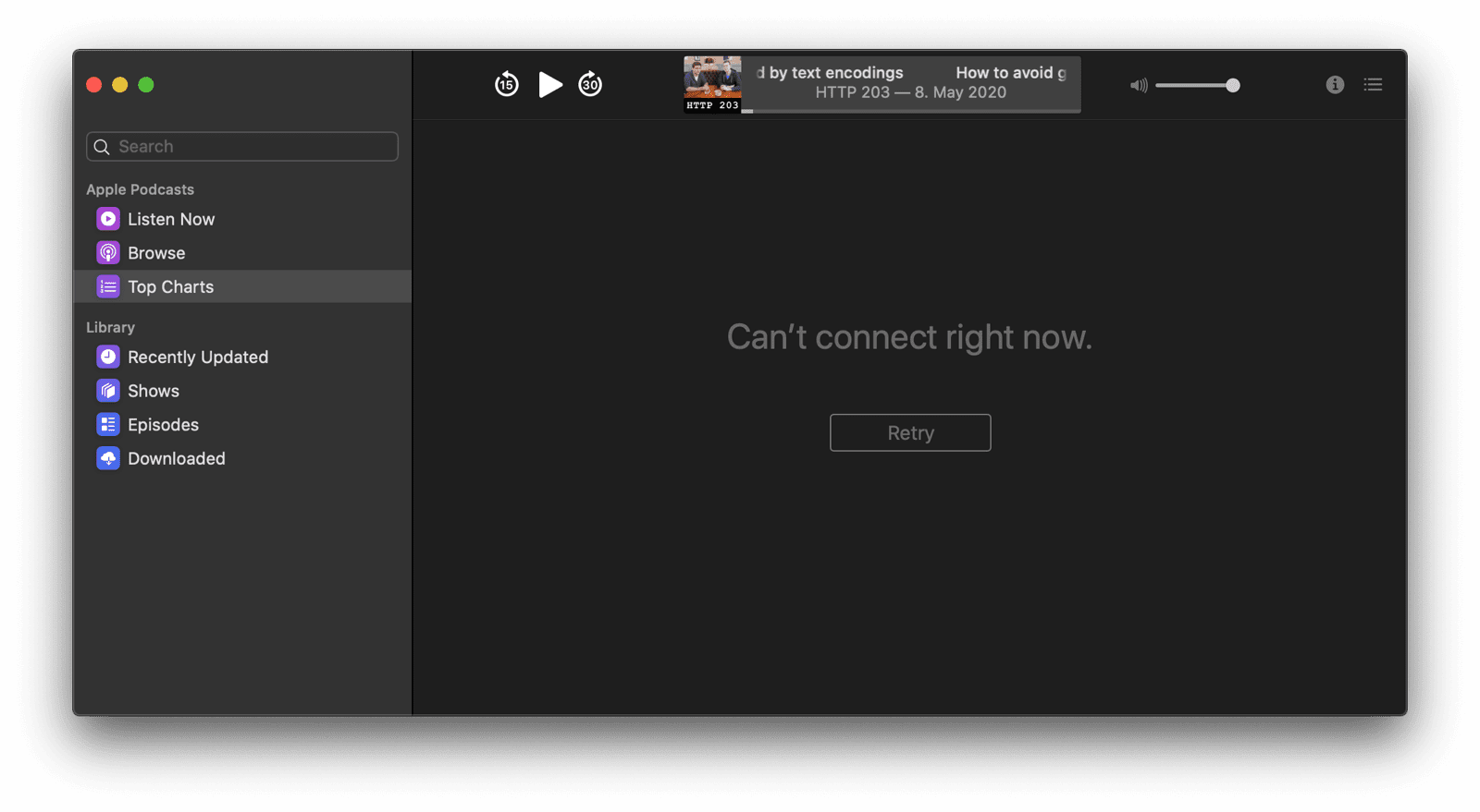 Подумайте о платформенно-зависимых приложениях на вашем мобильном телефоне или компьютере. Одно бросается в глаза: вы всегда можете ими воспользоваться. В приложении «Подкасты», даже если я офлайн, всегда есть чем заняться или что посмотреть. Даже при отсутствии подключения к сети приложение всё равно открывается. В разделе «Топ-чарты» нет никакого контента, вместо этого отображается сообщение «Не удаётся подключиться прямо сейчас» с кнопкой «Повторить попытку» .