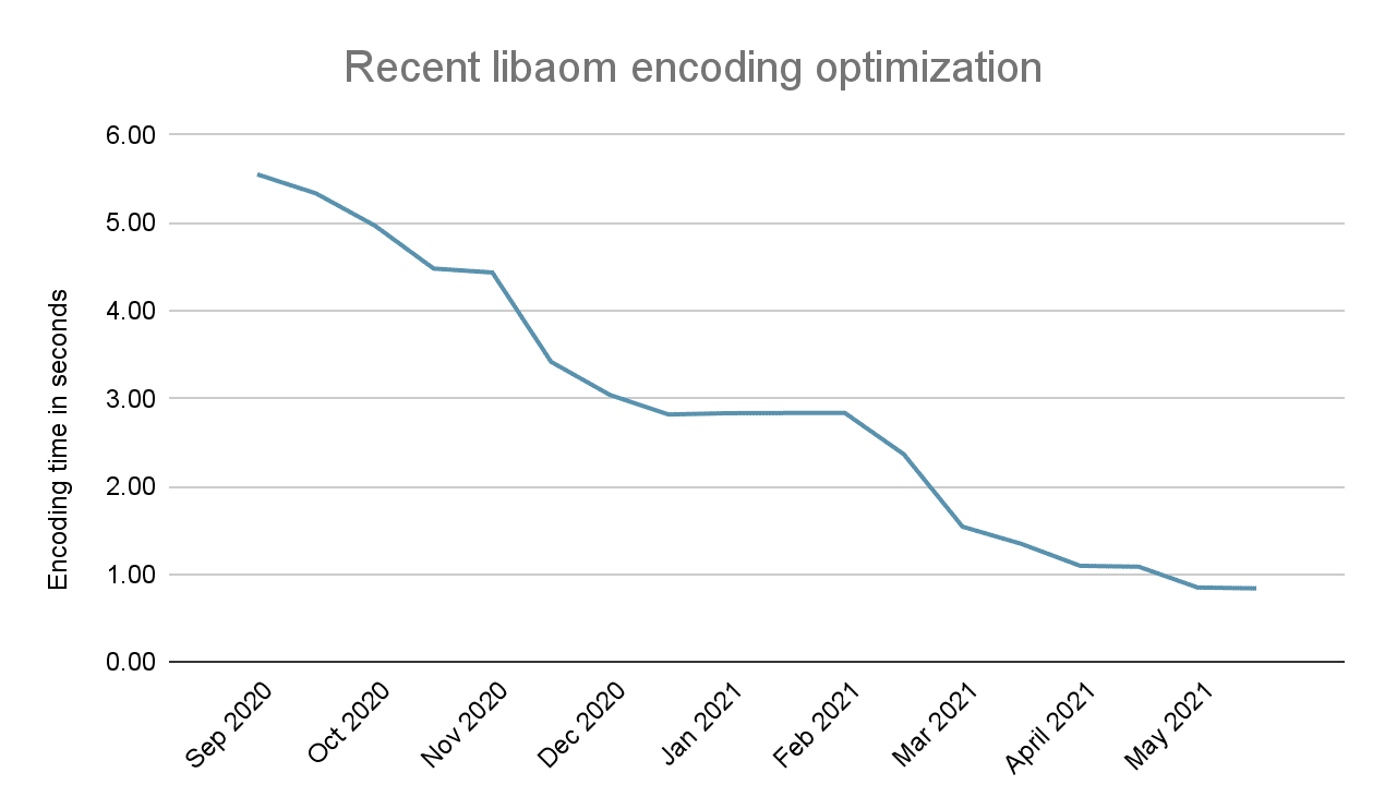 Libaom 是開放原始碼 AV1 編碼器和解碼器,由開放媒體聯盟 (Alliance for Open Media) 中的公司維護,並用於 Google 和其他會員公司的許多製作服務。在 libaom 2.0.0 版本 (Chrome 新增 AVIF 支援的同時) 和最近的 3.1.0 版本之間,程式碼庫中已加入許多靜態影像編碼最佳化功能。包括: