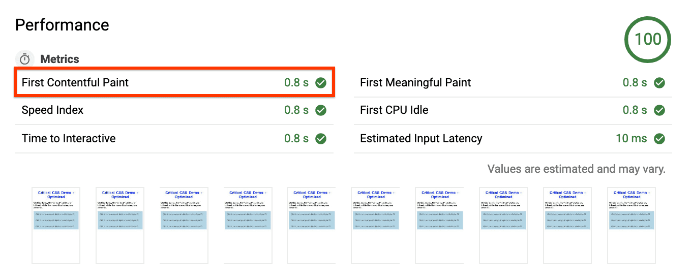 В отчете вы увидите, что время страницы FCP сократилось на 0,2 с (улучшение на 20%!):
