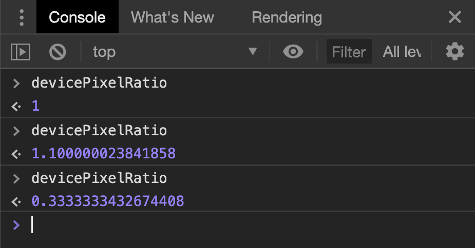 Por fim, o dPR também pode ser afetado pelo recurso de zoom do navegador. Se você aumentar o zoom, o navegador vai aumentar o dPR informado, fazendo com que tudo seja renderizado maior. Se você verificar devicePixelRatio em um console do DevTools ao ampliar, verá valores fracionários aparecerem.