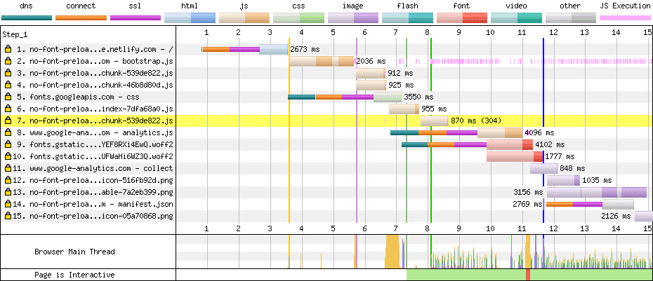 Новое соединение для index.html неизбежно. Браузер должен создать соединение с нашим сервером, чтобы получить содержимое. Новое соединение для Google Analytics можно было бы обойти, встроив что-то вроде Minimal Analytics , но Google Analytics не блокирует рендеринг или переход нашего приложения в интерактивный режим, поэтому нас не особо волнует, как быстро оно загружается. В идеале Google Analytics должен загружаться в режиме ожидания, когда все остальное уже загружено. Таким образом, он не будет занимать полосу пропускания или вычислительную мощность во время первоначальной загрузки. Новое соединение для манифеста веб-приложения предписано спецификацией fetch , поскольку манифест должен быть загружен через неуполномоченное соединение. Опять же, манифест веб-приложения не блокирует рендеринг или переход нашего приложения в интерактивный режим, поэтому нам не нужно так сильно беспокоиться.