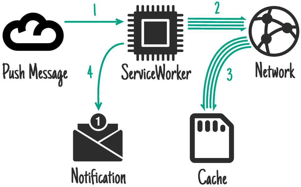Das übliche Endergebnis ist eine Benachrichtigung, die beim Tippen eine relevante Seite öffnet und fokussiert. Hierfür ist das vorherige Aktualisieren von Caches extrem wichtig. Der Nutzer ist zum Zeitpunkt des Empfangs der Push-Benachrichtigung online, möglicherweise aber nicht, wenn er schließlich mit der Benachrichtigung interagiert. Daher ist es wichtig, dass diese Inhalte offline verfügbar sind.