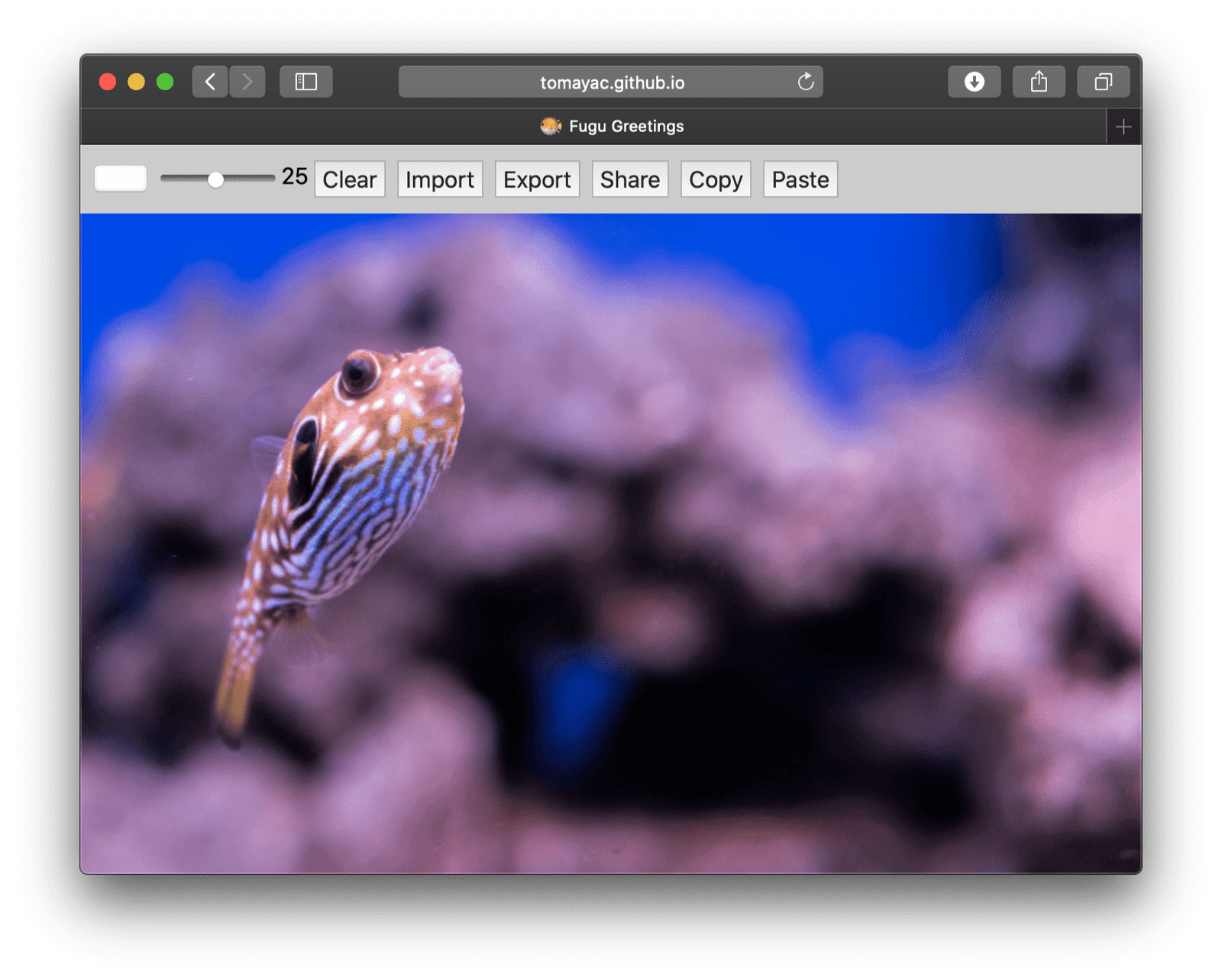 Fugu Greetings running on desktop Safari, which shows fewer available features.