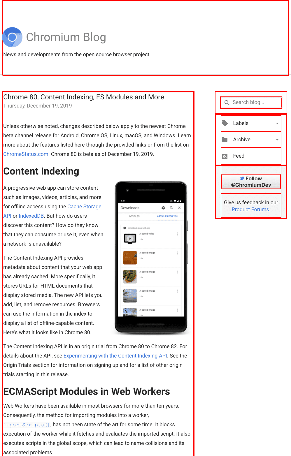 Tôi có thể đặt đường liên kết sâu đến bất kỳ phần tử nào được đánh dấu bằng hộp màu đỏ nhờ mã nhận dạng mảnh mà sau đó tôi sử dụng trong bộ băm của URL trang. Giả sử tôi muốn liên kết sâu đến hộp Gửi ý kiến phản hồi cho chúng tôi trong Diễn đàn sản phẩm ở bên cạnh, tôi có thể thực hiện việc này bằng cách tạo URL https://blog.chromium.org/2019/12/chrome-80-content-indexing-es-modules.html#HTML1 theo cách thủ công.
