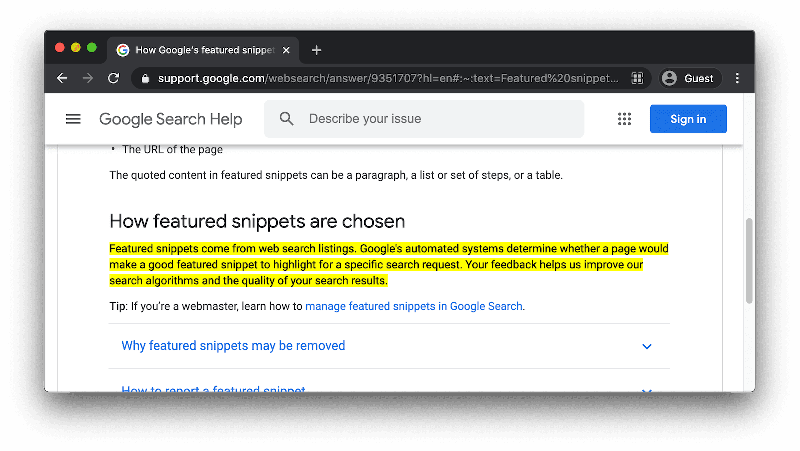 For some searches, the search engine Google provides a quick answer or summary with a content snippet from a relevant website. These featured snippets are most likely to show up when a search is in the form of a question. Clicking a featured snippet takes the user directly to the featured snippet text on the source web page. This works thanks to automatically created Text Fragments URLs.