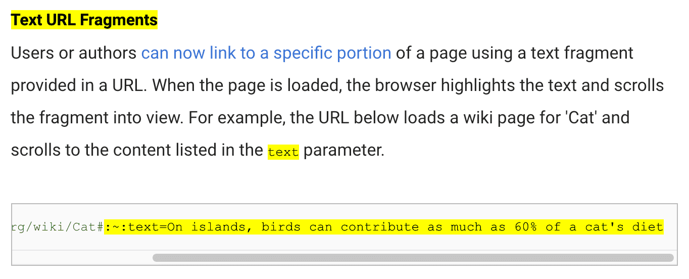 https://blog.chromium.org/2019/12/chrome-80-content-indexing-es-modules.html#:~:text=Text%20URL%20Fragments&text=text,-parameter&text=:~:text=On%20islands,%20birds%20can%20contribute%20as%20much%20as%2060%25%20of%20a%20cat's%20diet.