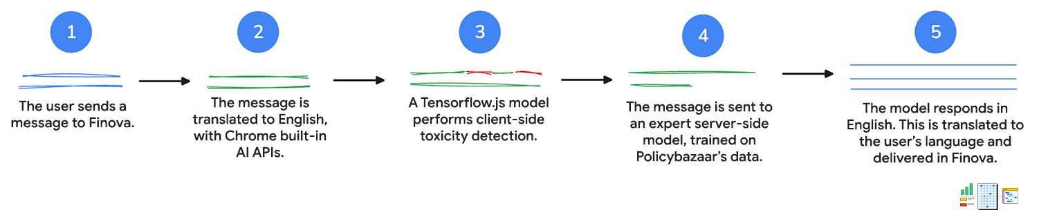 每則訊息都需要執行幾個步驟。除了語言偵測和翻譯之外,使用有害內容偵測功能時,每則訊息都需要與伺服器進行多次往返傳輸。透過在用戶端執行這些工作,Policybazaar 可大幅限制預估功能成本。
