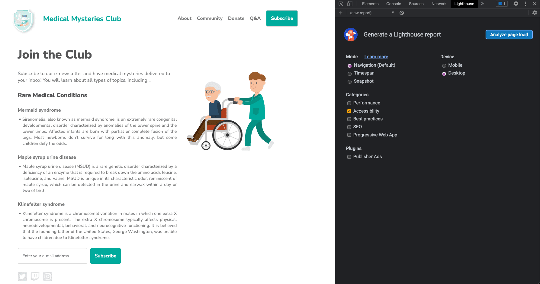 Site Web du Medical Mystery Club, avec le panneau DevTools du rapport Lighthouse ouvert.