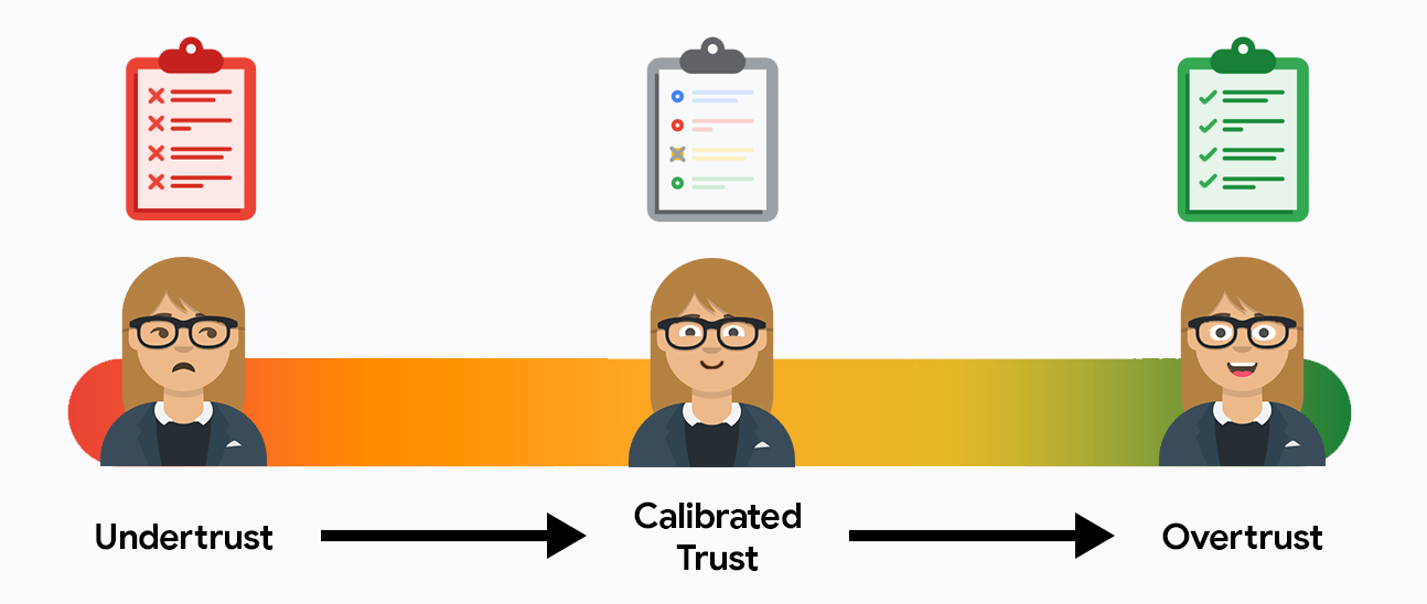At the beginning, users likely under-trust or over-trust your system. Under-trust means they won't use the system, and over-trust means they completely accept outputs, without checking for errors. Your task is to pull users into the golden middle of calibrated trust, where they rely on AI for efficiency while still taking responsibility for the final results.